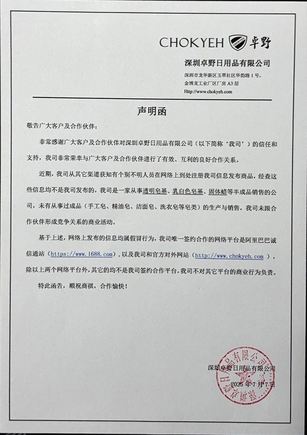 近期,我司从其它渠道获知有个别不明人员在网络上到处注册我司信息发布商品,经查这些信息均不是我司发布的,我司是一家从事透明皂基、乳白色皂基、固体蜡等半成品销售的公司,未有从事过成品(手工皂、精油皂、洁面皂、洗衣皂等皂类)的生产与销售,我司未跟合作伙伴形成竞争关系的商业活动。